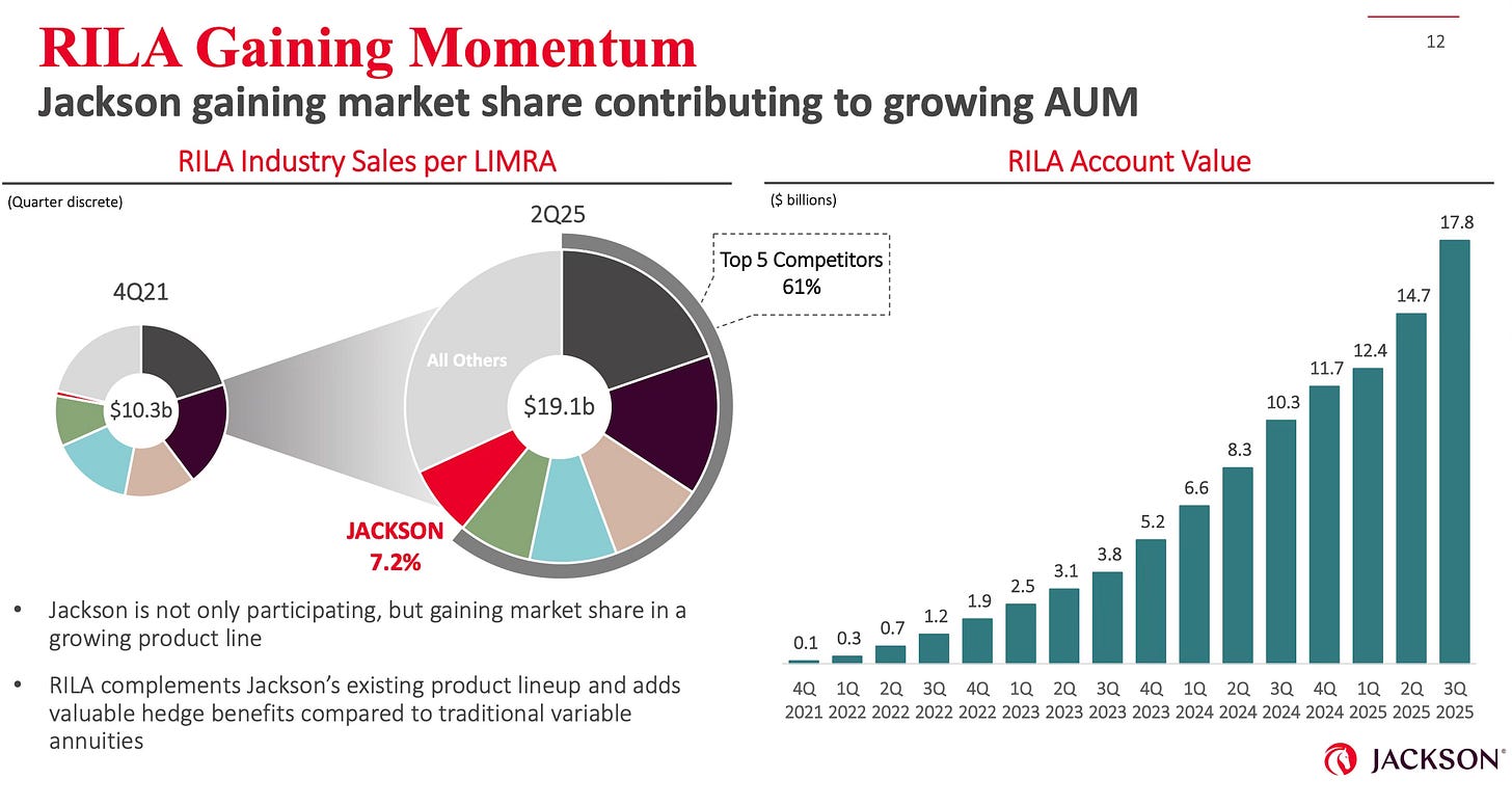 Jackson Financial looks insane and I should add more. I don’t totally understand how all the accounting works, with life insurers you never do, but they are smashing the ball out of the park with these RILA products (index funds with hedges and caps, like structured products). Between dividends and share buybacks Jackson is returning over $1bn/year (13% of market cap).