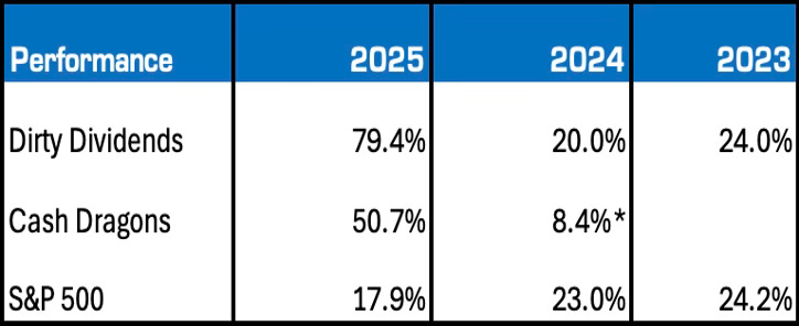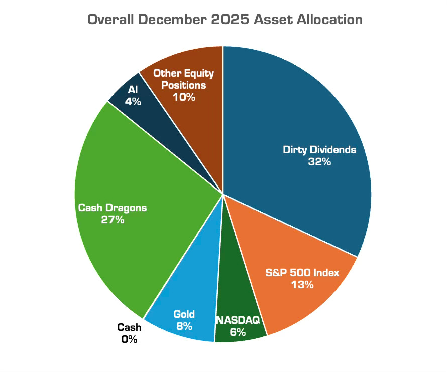 We’ve been trying to pivot Dirty Dividends more towards Asia (the Asia Pivot), but it’s not going well. The move in the European Banks overwhelmed our allocation of dividends and new money buys to Asia. Oh well. It is what it is. We will continue with the Asia Pivot in 2026.