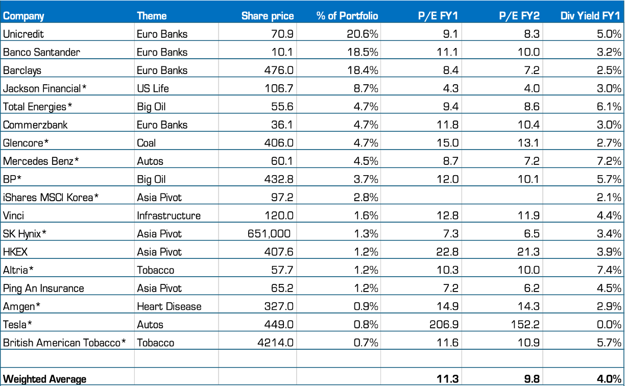 This started out in 2023 as a portfolio to buy all the anti-ESG sectors institutional investors didn’t want to own. Energy, Tobacco, Autos, and Banks. The Untouchables. They were all super high yielding, hence the name. With our Asia Pivot the portfolio is evolving, and it’s not as dirty, but I still like the name.