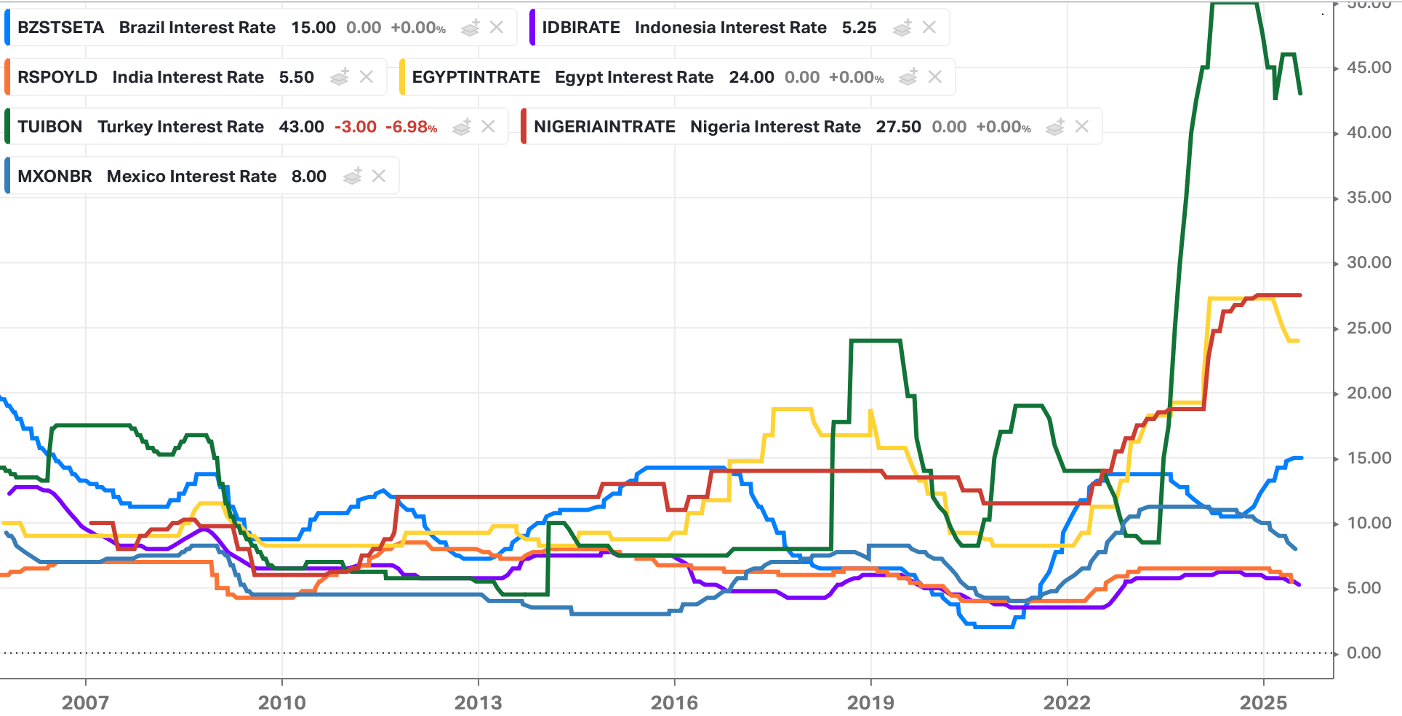 The next step after currency stability, and calmer inflation, is rates start to fall in emerging markets. Brazil stands out with very high real rates.