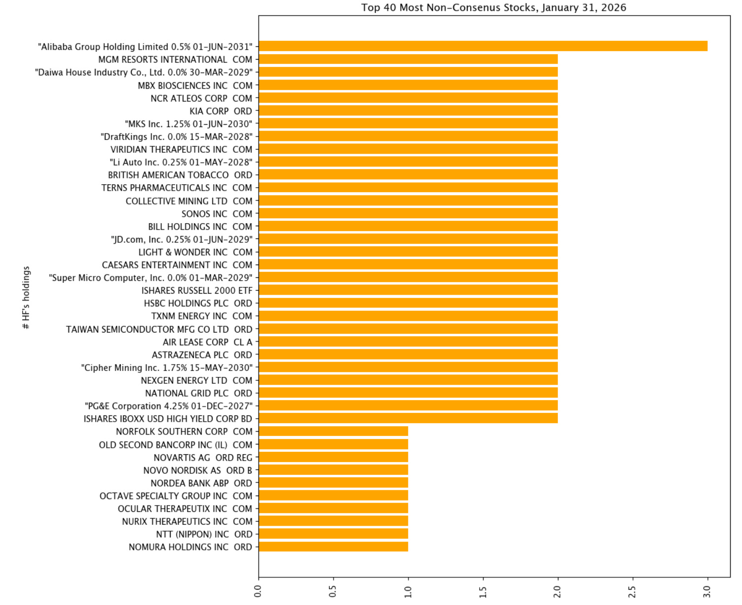 Here we take the all funds which have no overlap between their Top 20 holdings and our Top 21 most consensus stocks list. We call these ‘non-consensus funds’. We then loop through their holdings to see the favourite ideas amongst ‘non-consensus funds’. Effectively, what is consensus among the non-consensus?