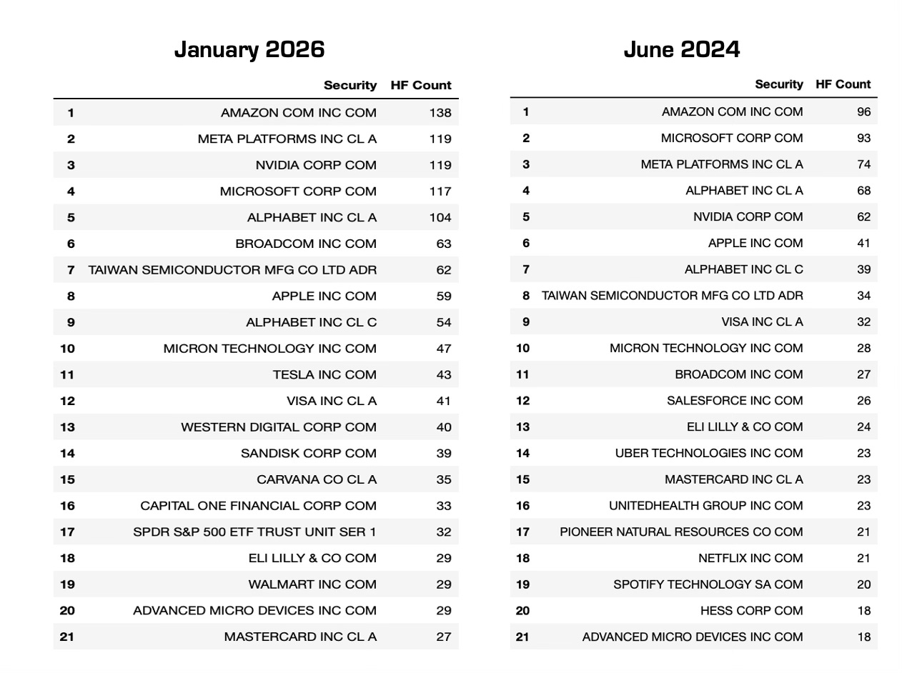 For example, take the top 21 positions in January 2026 compared with June 2024. 19 months have passed and the top holdings are mostly the same.