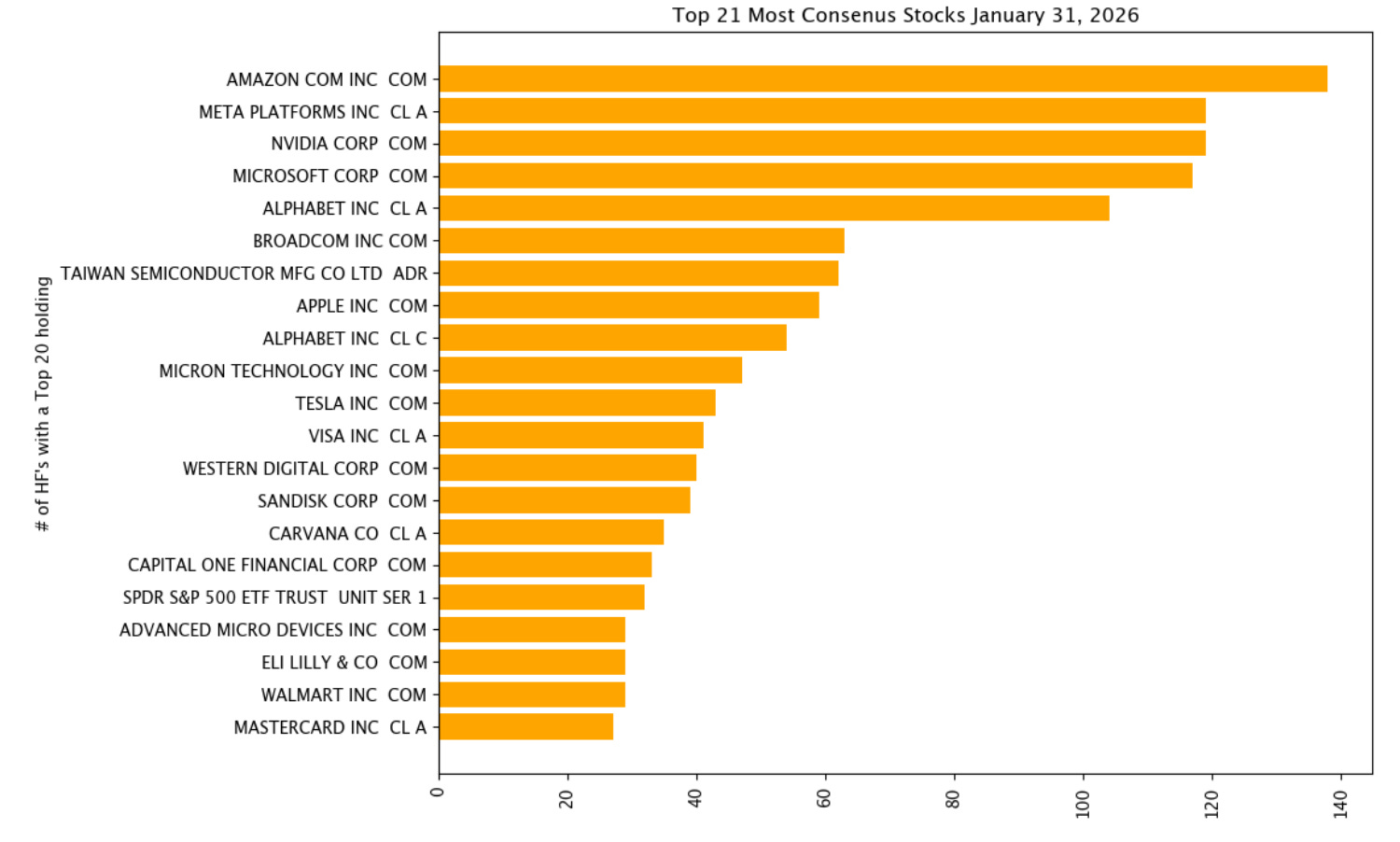Amazon is the most popular stock. 31% of all hedge funds own Amazon in their Top 20 positions.