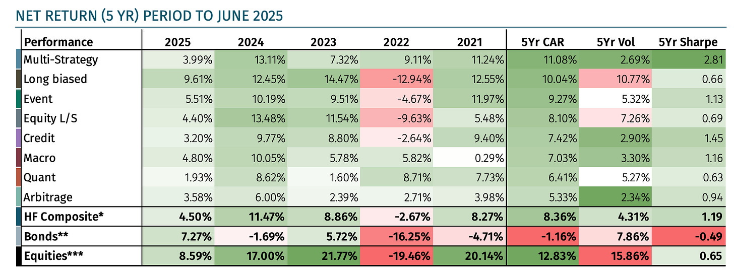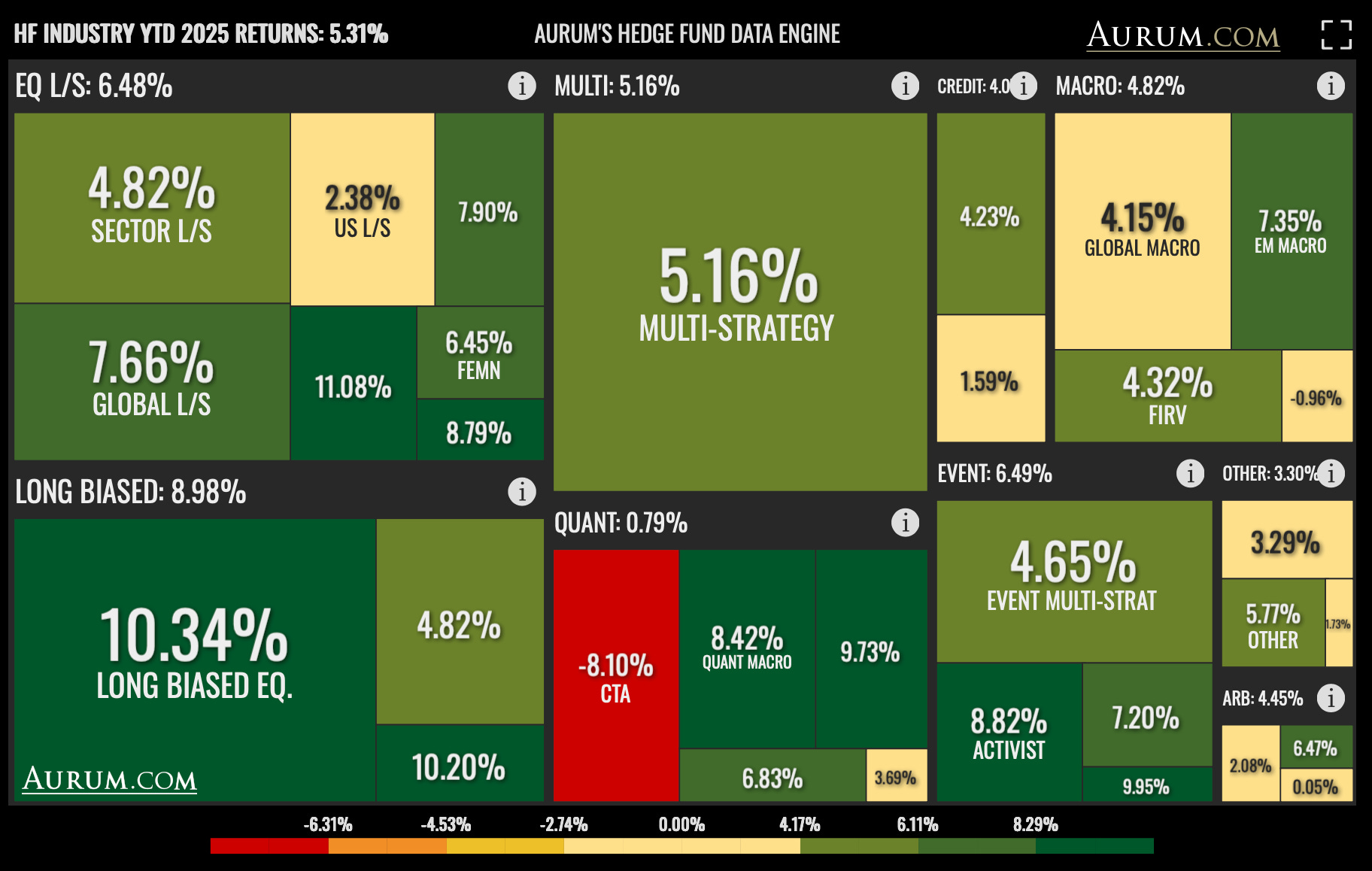Hedge funds are doing relatively well. The industry is +5.31% ytd and every strategy is performing, except the CTA’s.