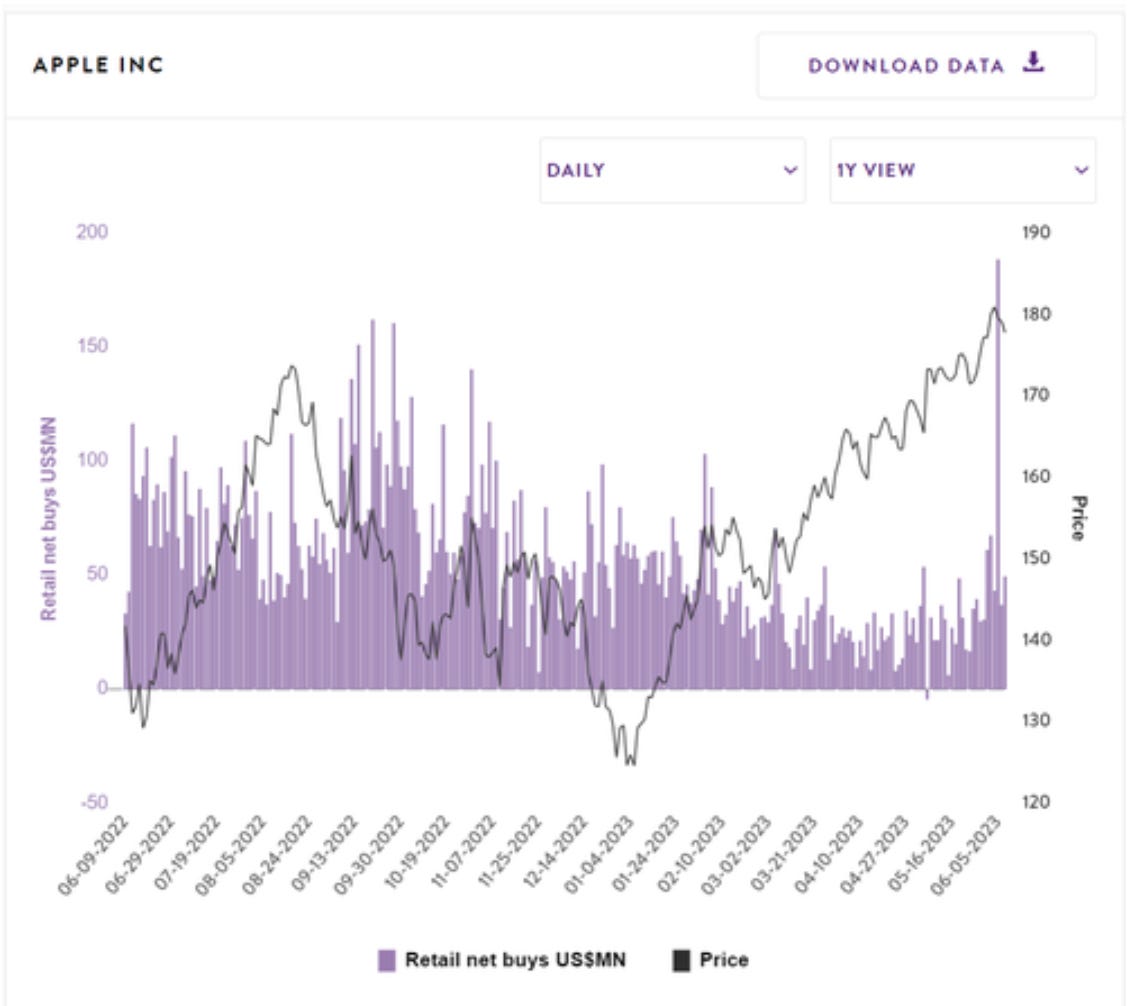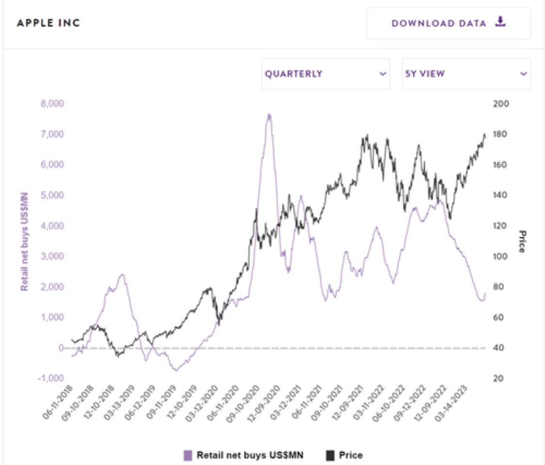 But overall retail flows into Apple are still on the lows, despite the stock at all time highs.