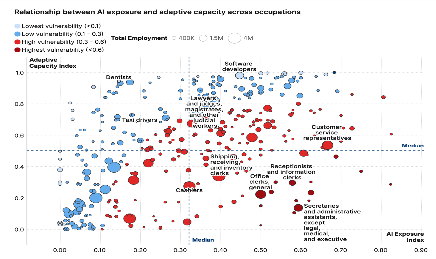They then identify the occupations with a high risk of AI disruption, but where workers have low incomes and might have a harder time adapting (bottom right quadrant).