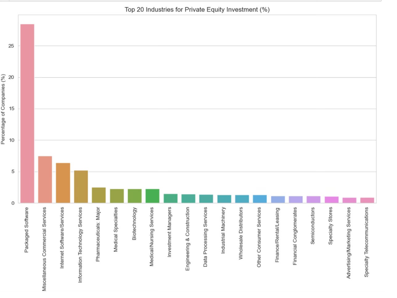 28% of PE&VC holdings are classified as ‘Packaged Software’ with another 6% classified as ‘Internet Software Services’. Note, this is by number of companies, not value.