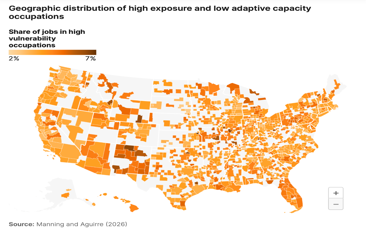 When Manning and Aguirre map the % of workers with both high AI exposure, and low ability to adapt, it averages out to 3-4% across the country.
