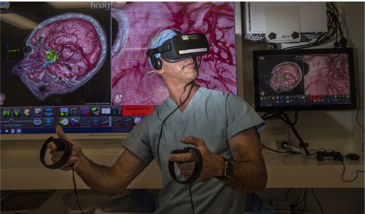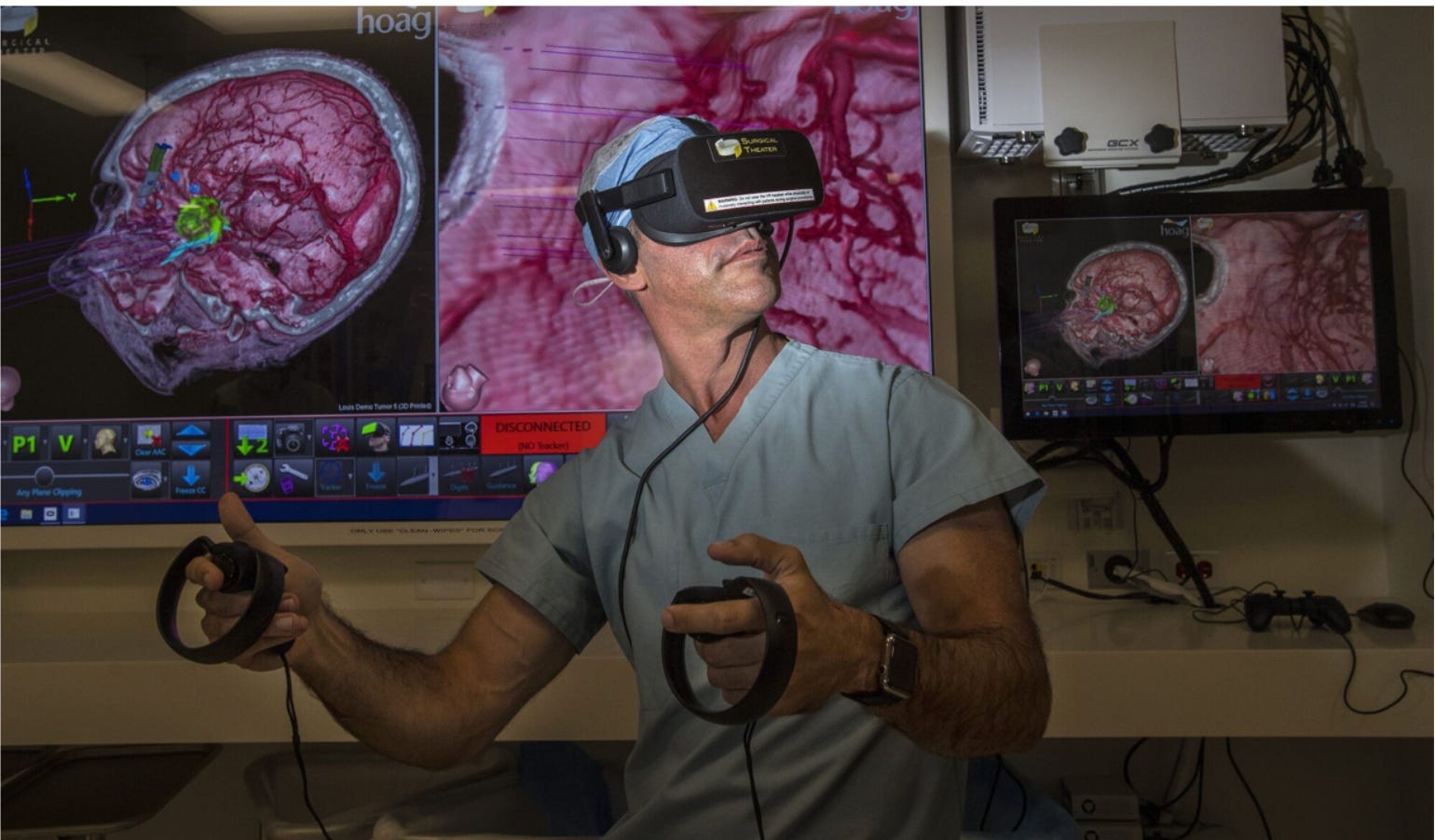 The display was showing how the next step of robotic surgery is to incorporate AI and VR. The VR helps the surgeon to have more depth perspective than a 2D screen.