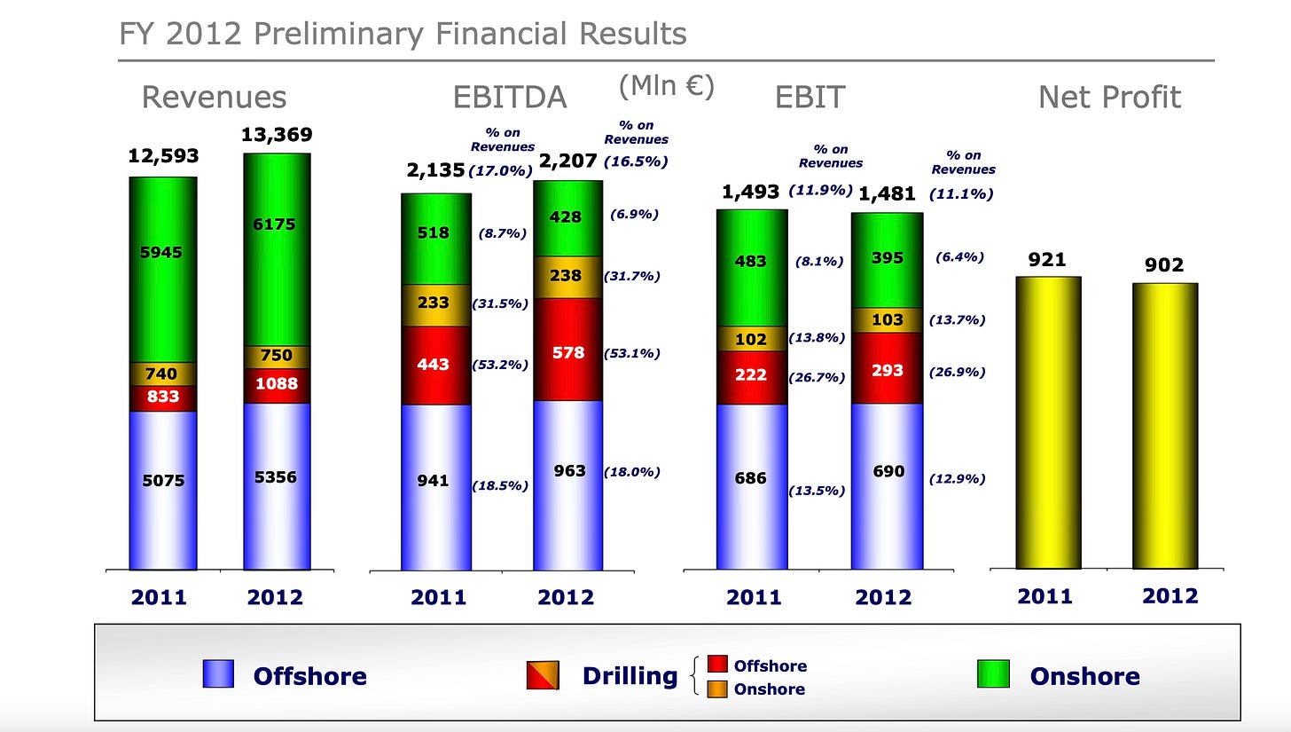 Saipem’s combination of high spec subsea construction ships, drilling rigs and onshore construction captured every aspect of the energy bull market. In 2012 the company was generating 11-12% EBIT margins on EUR 13 billion in revenues and earning EUR 900mn in net profit annually.