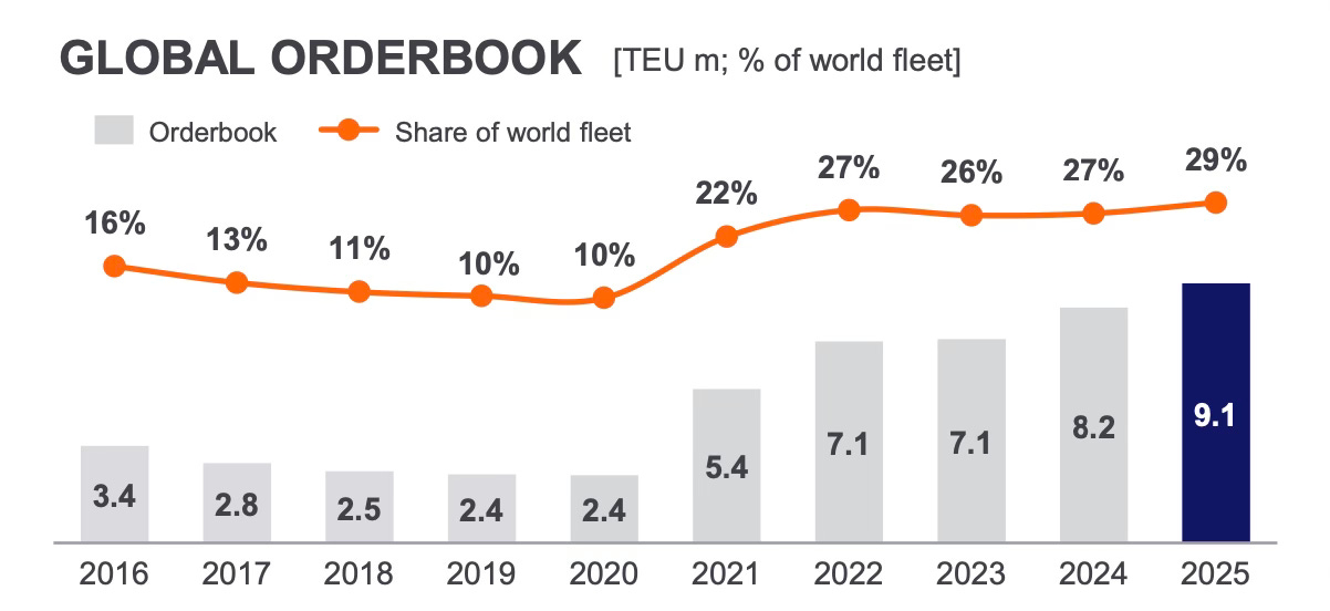 Then whenever there are supernormal profits, everyone orders new ships. Like now. The order book for new ships to be delivered is a whopping 29% of the current global fleet.