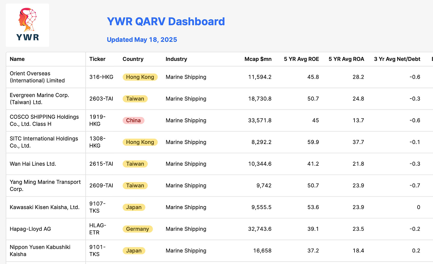 The QARV rankings (including China and without) are overrun each month with container shipping companies like Orient Overseas, COSCO, Wan Hai, Evergreen, Hapag Lloyd, Maersk, Kawasaki Kisen, Nippon Yuen, etc.