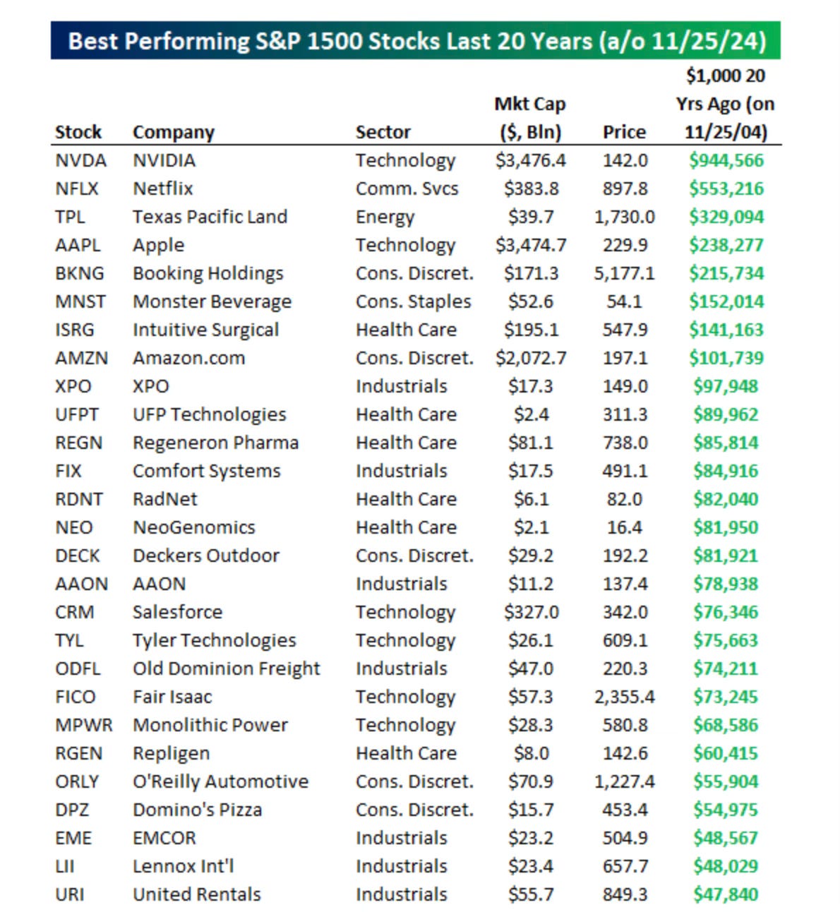 Amazon, Apple, Tesla, Nvidia, Intuitive Surgical, Netflix, Mercado Libre, Palantir, Axon Enterprise, Costco, Monster, TJX.