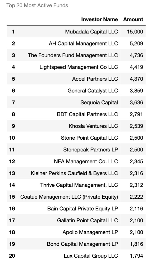 This most active funds calculation has complications. We add up every investment round a fund is involved in and sum the deal values. The catch is we are summing of total deal values, and we don’t know the size of the fund’s participation. But it’s the best we can do.