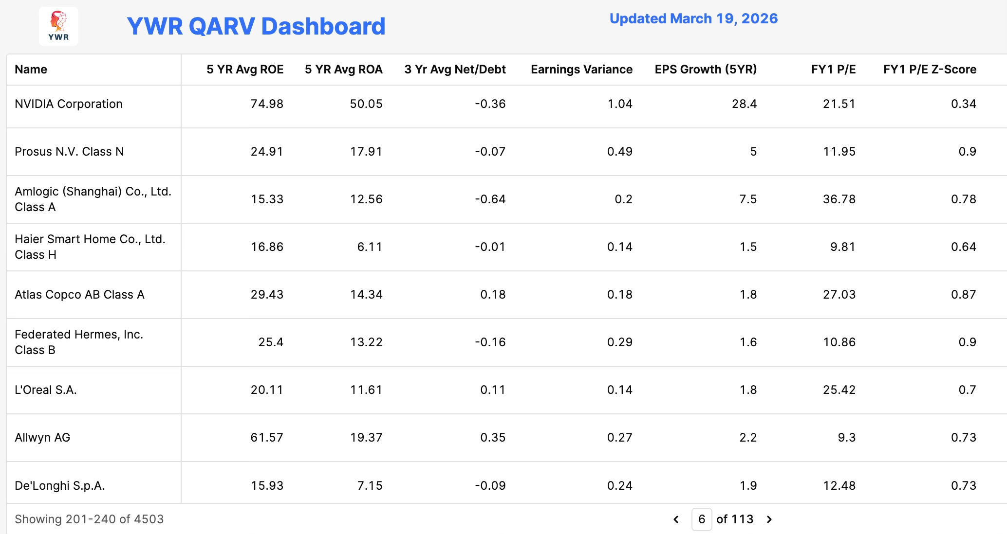 The monthly YWWR QARV rankings screen highlights stocks with a combination of high ROE’s, low debt, earnings consistency, and relatively attractive valuations.