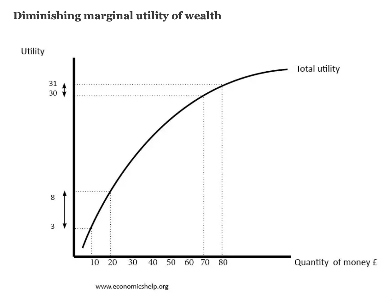 You realise it would be nice to have $30,000, instead of $20,000, but the bear case of dropping to $10,000 would be catastrophic. Economists run tests on this, offering sample bets to real people, and in most cases people need close to a 2:1 payout to that bet (for example +$20,000 or -$10,000). It depends on the person, and the starting point (how much money they have), but in general there is an asymmetry. The 2nd derivative of the curve is negative. If you have money you prefer to keep it.