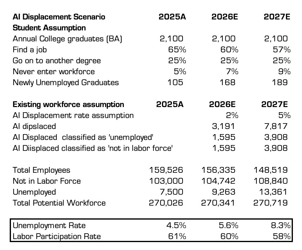 2.1 million kids graduate college with a BA each year in the US. Be nice. Assume 60% get a job and 25% go on to get another degree. Of the remaining 15% which don’t get a job, assume half don’t file for unemployment. This means in 2026 we get 168 thousand newly unemployed college kids added to the pool of unemployed workers. In 2027 assume the AI effect gets worse and only 57% get a job. Another 189 thousand are added to the unemployment pool.