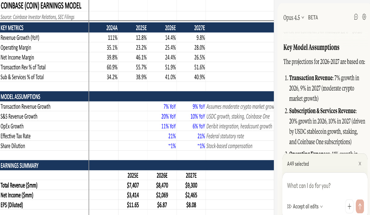 For example, take this earnings model on Coinbase using Claude Excel.