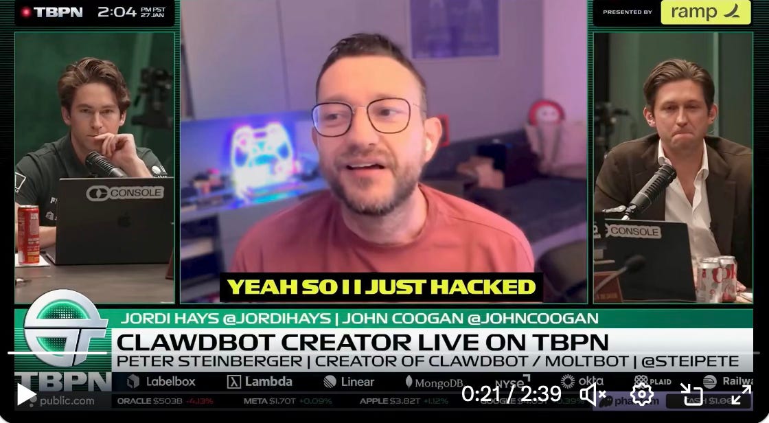 I know we say maybe this is ‘productivity enhancing’… but I’m sorry, these things are just too good at too many things. Yes, if you are a solopreneur it’s a gift from god. But for many corporate workers a fully provisioned Clawdbot can do 60% of their role. For many jobs Clawdbot will be a wipeout.