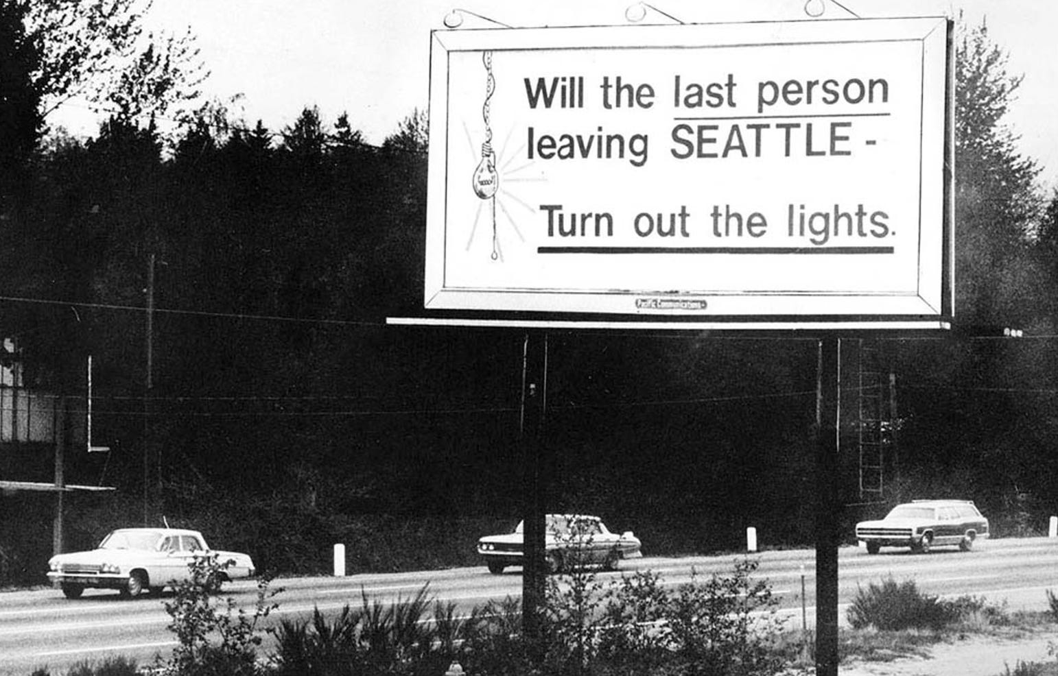 Seattle in the 1970’s was dire. Seattle had just experienced the ‘Boeing Bust’ where Boeing had cut its workforce from 100,000 to 40,000. Seattle’s other big industries were the port and timber, which weren’t growing either. Nobody could see how Seattle would ever grow again and people were leaving. It was so bad that two real estate agents put up a sign along the highway asking the last person leaving Seattle to turn off the lights.