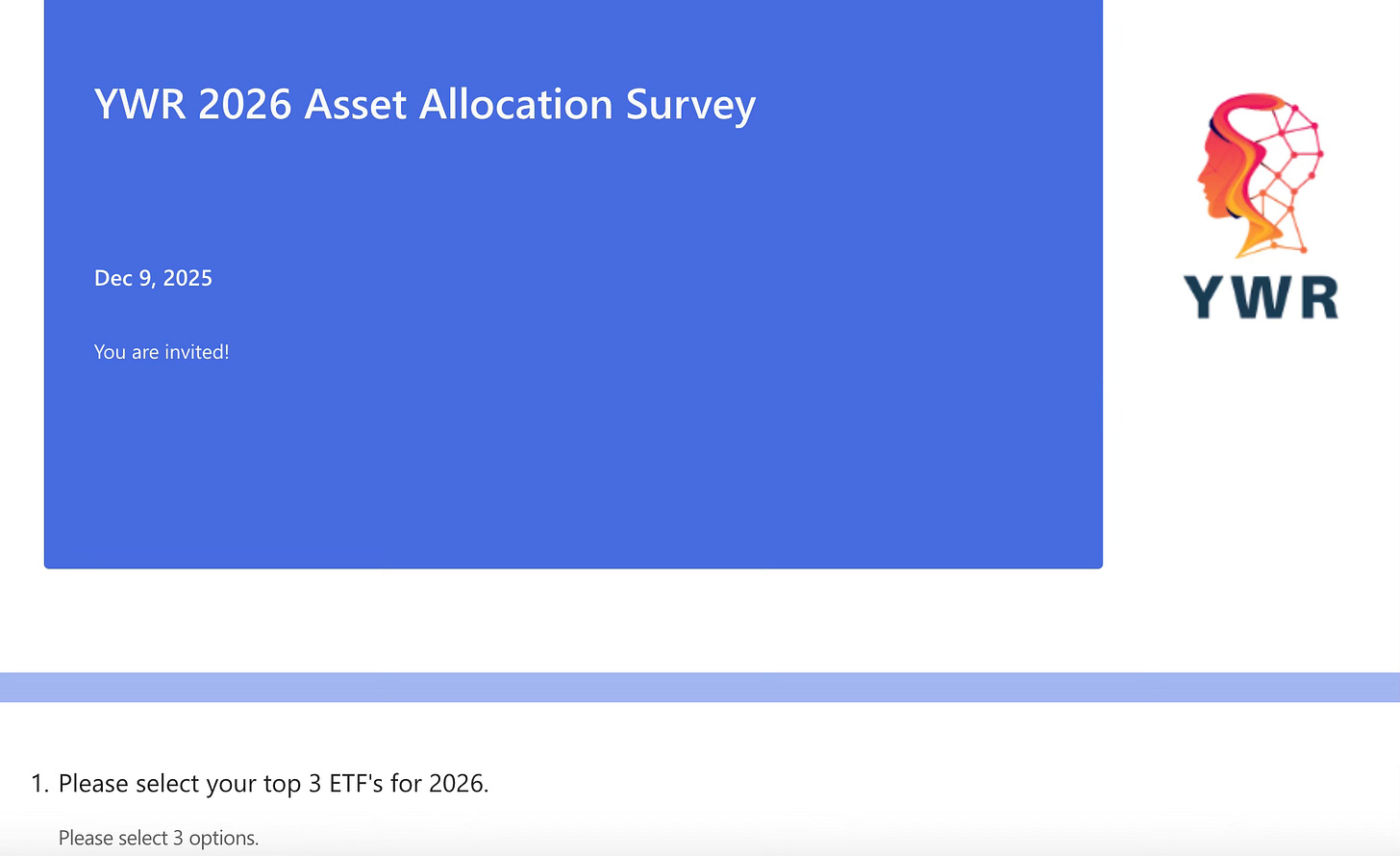 Finally, and this is the most important question, pick 3 ETF’s you expect to perform well in 2026. There is the option to add 1 ‘Other’ ETF of your choosing. We want to get a good sense of what everyone likes for next year.