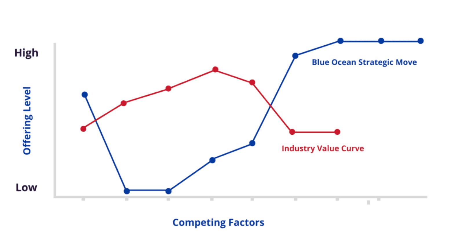 The key Blue Ocean concept is ERRC (Eliminate, Raise, Reduce, Create) and the product strategy canvas.