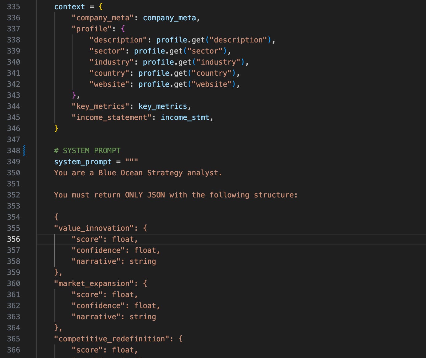 A few coffees later we had a program which would pull a stock (name and ticker) from my daily_universe table of 500 US stocks, then send that company info to the OpenAI API along with a long prompt of how to analyze a company using the Blue Ocean Framework. The 1st cut response from OpenAI would then be sent to Claude to review. Claude might point out if for example the OpenAI analysis did not use concrete product examples. These recommendations from Claude would then be passed back to OpenAI to be incorporated in a final response which would be stored in a new SQL table called blue_ocean_scores.