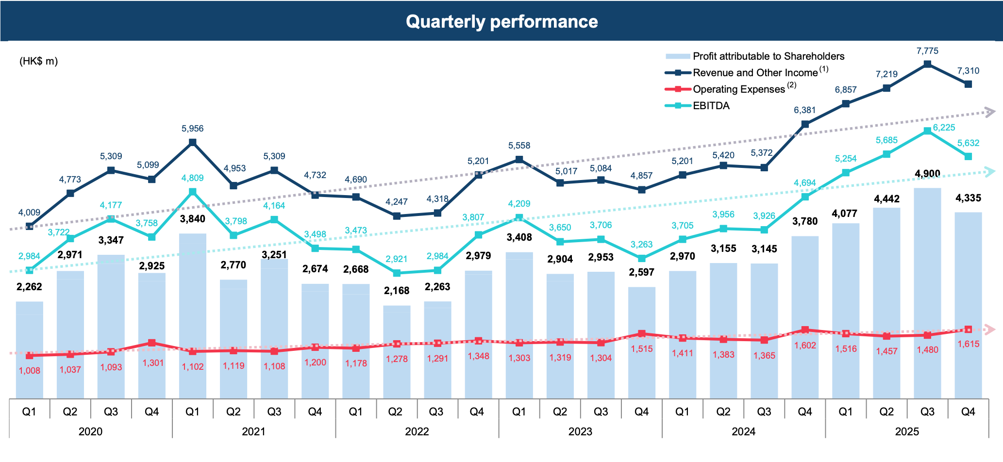 Revenues (blue line) +32% and costs (red line) +5%. A higher tax rate in 2025 was the only drag.