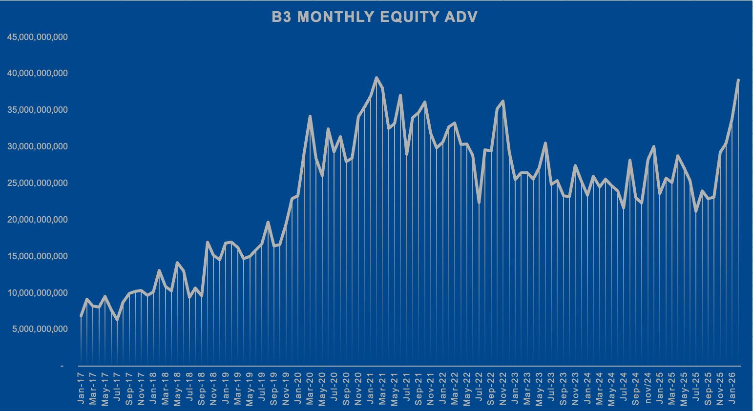 But the Brazil bull market may have finally started. Cash equity volumes in 1H 2026 are off to a strong start through February.