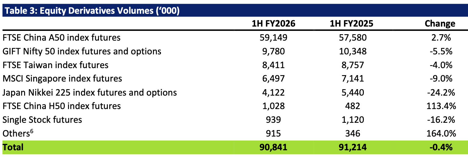The SGX share price has performed well (+48% over the last year), but the earnings momentum has been less than at HKEX. Adjusted 1H 2026 EPS growth (December 2025) was just +11.7%.